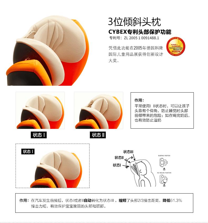 这是CYBEX独有的一个特色专利技术,给儿童头部提供最佳侧面保护。此革命性的技术使得儿童头部的平衡点向后倾并防止儿童睡着时向前倾。当侧面撞击发生时,儿童敏感的头部可以停留在安全座椅的安全区域内并防止孩子睡着时头部向前耷拉着而不舒服。