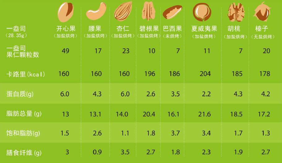 A:以开心果为例,我们做过一项研究,就是拿开心果和全麦面包对比,42g的开心果的营养含量基本等同于100g的全麦面包,但具体用量可以根据个人的喜好和习惯进行选择,每日食用不宜超过1盎司(约49粒,28g),并且因为其中含有膳食纤维量高,很容易让人有饱腹感,所以对于需要控制体重的人来讲,餐前食用更有利。其他坚果,如核桃仁、杏仁等,每日食用也不宜超过30g。