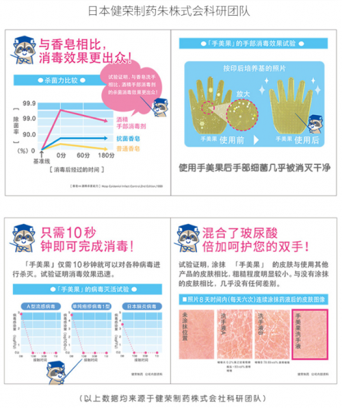 健荣制药成立于1946年,是具有悠久历史的日本知名品牌,而手美果系列洗手液则是品牌旗下人气最高的产品,一直以来都是日本妈妈们的日常家庭必备用品,是一款同时适合孩子和大人使用的洗手液。不但可预防多种病毒和细菌,且使用方便。让宝宝在愉快的享受集体生活,建立初级社交能力的同时,远离人群所带来的感冒、手足口病等婴幼儿易感病毒烦恼。