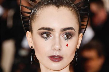 这一款泪痣不仅适合亚洲女生,欧美女生装扮起来也是非常精彩。演绎了赫拉的Amber Heard绿色的眼瞳搭配上金色闪钻,带有棱角的眉眼,配上大红唇和红宝石耳坠,真的是十分亮眼了。而在去年MET GALA上,莉莉柯林斯的泪眼圣母妆容也是十分亮眼。红毯造型日日常要更加夸张一些,黑色系妆发在眼下是倒三角形状的黑色闪钻,一滴红色泪珠让人惊艳,棕红色口红在中间加上高光,让人感觉到是仙女一般。