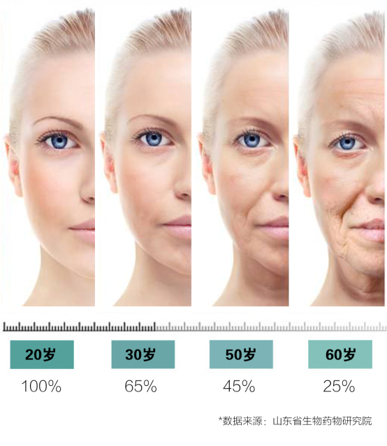 肌肤老化的一大元凶——干燥 ,而干燥正是因为随着年龄增长肌肤中TA的含量下降而引起,TA就是胶原蛋白的守护神、水光肌法宝——玻尿酸(玻尿酸一般指透明质酸)。人体内的玻尿酸含量是随着时间推移而日趋减少的,如果将20岁时人体内的玻尿酸含量定为100%,那么30岁时为65%,50岁时为45%,60岁时只剩25%,想要延缓肌肤老化,补充肌肤内玻尿酸含量是重中之重。