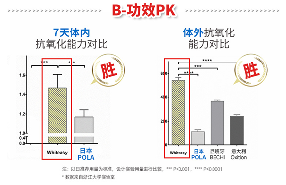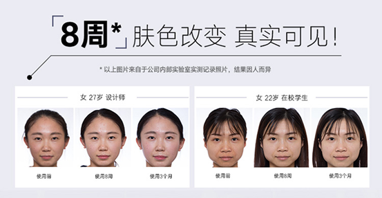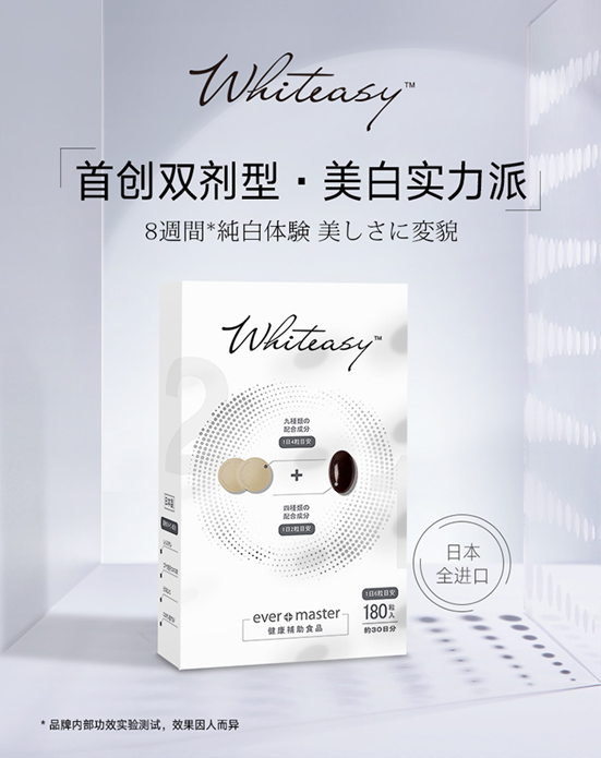 Whiteasy美白雪肌丸的卓越创新之处,是该产品采用了双剂型组合设计,也就是片剂+软胶囊。片剂采用水溶性及易吸收的功效成分制成,有效成分高,可以保证吸收迅速。而软胶囊则将脂溶性功效成分溶于植物油中,提高了溶解度及口服生物利用度,可保障成分的充分吸收。消费者可根据自身特点,选择不同的剂型,在保证功效成分稳定的同时提高口服生物利用度。实验结果证明,2-3周即可看到肤色明显改善,变得白皙光泽。