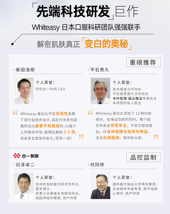 据EVM品牌团队介绍,此次EVM联合日本口服科研团队,双方强强联手打造了独特的Whiteasy美白雪肌丸。参与此次产品研发的包含日本现任合一制药CEO柴田浩树、东京健康诊所院长平石贵久、白泽抗加龄医学研究所所长白泽卓二以及国际医疗福祉大学特任教授村冈修等。