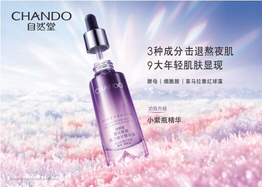 全新升级的自然堂小紫瓶精华选取大牌同款修护成分酵母、网红焕亮成分烟酰胺、以及卓越抗氧成分喜马拉雅红球藻,三种成分、科学配比、多效合一、功效加乘,在抗衰抗氧化能力更上一层楼的同时,还兼顾提亮、水润、抗皱,有效击退“熬夜肌”,让肌肤更加滋润、平滑、细致、柔嫩、饱满、匀净、透亮、有效改善干纹、改善细纹,9大年轻肌肤即刻显现!