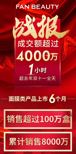 FAN BEAUTY的面膜类产品上市6个月销售超过100万盒,累计销售8000万;