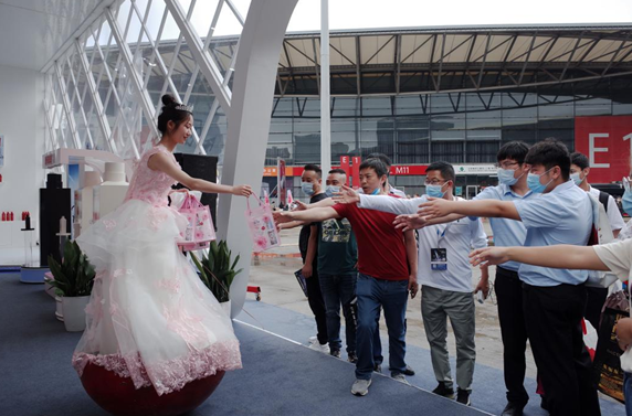 展会期间特邀模特现场互动,引人驻足,滑稽的不倒翁与粉色礼服的结合,特有的愉氛围将品牌的优雅灵动展现得淋漓尽致,不仅加深了新客户对品牌形象的认识与了解,同时也为合作奠定基础,现场络绎不绝,市场的复苏,也为参展商带来了信心!