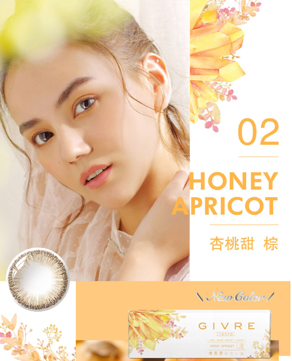 甜美的杏桃甜棕色也是绮芙丽家非常受欢迎的一款彩片,镜片的花色设计同样采用三重彩色搭配,大面积的杏桃色搭配深邃的核桃色与清新小黑环,就像是淋着蜂蜜的玻璃珠,通透又有活力!日常通勤、约会都很适合,裸妆、大地色妆容都能驾驭!