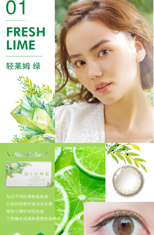 网红玻璃珠——清爽莱姆绿也是绮芙丽家很受消费者喜爱的彩片,镜片设计上以绝妙的⻘柠绿为主⾊调,结合⼩⿊环与阳光⾦,碰撞出与众不同的清新晶莹感!大面积的莱姆色,是温暖的绿色,不发白不夸张,非常适合亚洲人,上眼后如同夏日水果糖般透亮,干净又温柔!