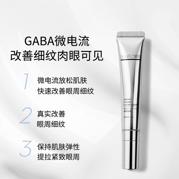 GABA的作用机制和肉毒素相似,也叫涂抹式肉毒素。经华熙生物研究院证实,2%的GABA涂抹眼周后10分钟后即可得到明显的改善细纹效果,且可持续起效8小时。BM肌活微电流眼霜中GABA的含量为3%,可在安全浓度之内达到更好地改善细纹的效果。