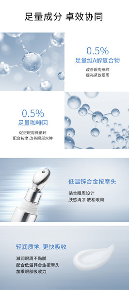 此款眼霜不仅在成分上做到了极优配比,在“硬件”上也是科技感满满。自带的低温锌合金金属按摩头,在解放双手的同时还能最大限度满足哪里有纹点哪里,满足现代快节奏下广大消费者对于“一物多用”的护肤需求。