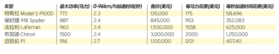 我收集了一些数据,把功率、0-96公里/小时加速时间、价格这些数据放在一起,计算出了五辆高性能车每马力的花费是多少,每秒加速时间的花费是多少。