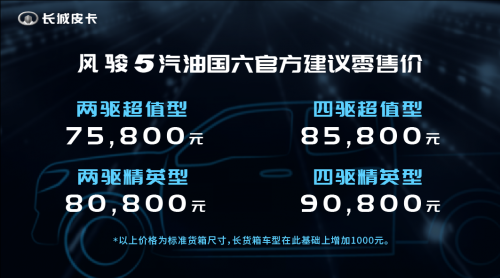 作为保障民生的“利器”,长城皮卡在产品力的打造上同样不遗余力。此次发布的长城皮卡风骏5汽油国六和风骏7新冠军版升级而来,为脱贫攻坚战提供了更加坚实的后盾。其中,风骏5汽油国六搭载航天三菱4K22D4M汽油发动机,发动机排量为2.4L,满足国六B排放标准,最大功率118kW,峰值扭矩230N•m,动力强劲。低至8.7L/100km的油耗和1.68米长货箱,使风骏5汽油国六更经济高效、装载能力更强,在运输上更具优势。