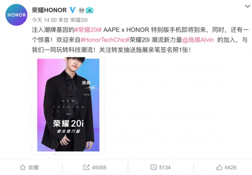 不得不说,网友们的猜测真的是非常准。5月17日,荣耀官方微博公布了和施展合作的消息: “注入潮牌基因的#荣耀20i #AAPE x HONOR 特别版手机即将到来,同时,还有一个惊喜!欢迎来自#HonorTechChic#荣耀20i 潮流新力量@施展Alvin 的加入,与我们一同玩转科技潮流!”
