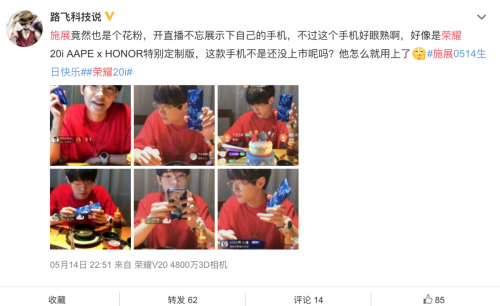 5月14日,施展在个人的生日直播中,使用荣耀20i AAPE x HONOR特别版幻野蓝配色的手机时,就有很多网友猜测荣耀要和施展合作。