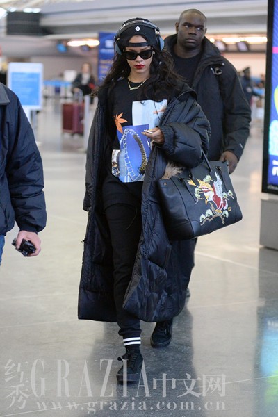 再看蕾哈娜的搭配,反扣的帽子、大耳机、运动裤和球鞋都是整齐划一的运动风,仅靠手上一只Ralph Lauren中国风手袋带出混搭的感觉,真是明智又赏心悦目。
