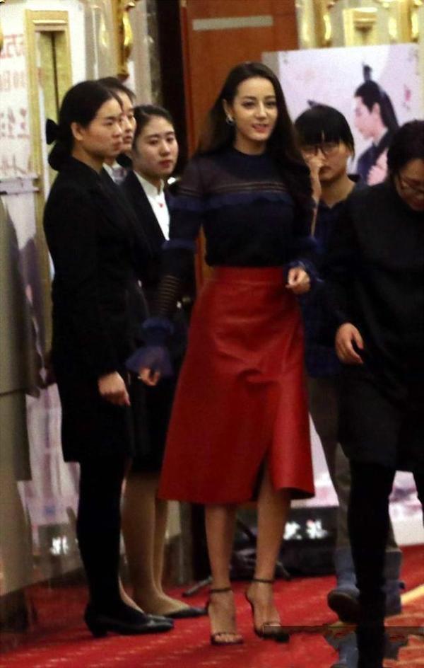 黑色紧身上衣搭配红色半身裙,脚踩一双一字带高跟鞋,妖娆的身材,高挑的个子,迪丽热巴美得没有瑕疵。