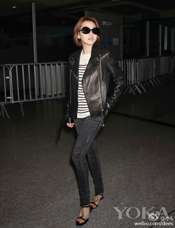 休闲的条纹上衣与刷旧烟管裤,搭上皮衣后平衡掉原本的休闲感,展现时髦帅气,不会过度夸张,墨镜的画龙点睛完美呈现巨星风范。