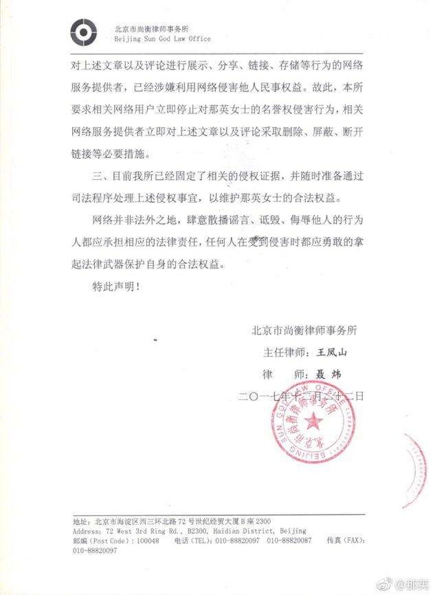12月22日晚,已近一年未更新微博的那英重归微博,就网络流传的“在国家公祭日赴日本开演唱会”等传闻发出严正声明:“不再沉默!对网络暴力说不!”她发布律师声明称,自己在2017年国家公祭日当天在为录制《国家宝藏》节目做准备,次日录制了该节目,这期间一直在北京,并未去日本开演唱会。声明称那英只在2010年12月21日在日本东京举办过演唱会,但2014年2月27日,十二届全国人大常委会第七次会议决定将12月13日确定为南京大屠杀死难者国家公祭日。因此,声明指责相关文章及评论捏造事实,丑化那英人格,涉嫌侵犯那英名誉权。