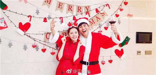 12月25日韩国女星秋瓷炫在微博晒出与老公于晓光的圣诞照片,怀孕4个月的她小腹微隆,气色不错,配上一身大红色,十分喜庆。