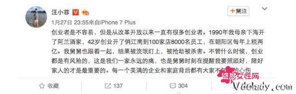 27日深夜,汪小菲在微博发文感叹创业者不容易,并回忆起舅舅因此失去生命,称“这是我们一家永远的痛”。汪小菲在微博中提到,母亲张兰一手创立俏江南集团,到后来开了100家分店,每年缴税2亿,成为餐饮界女强人。舅舅跟着一起做,却被流氓盯上遭抢劫杀害,汪小菲直言“这是我们一家永远的痛”。他认为创业都有风险,而舅舅的例子也提醒他要照顾好家人,“”。