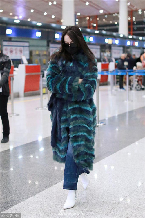 近日,迪丽热巴现身首都机场。热巴在宣布退出《跑男》后现身,双手抱胸疾走,大衣颜色好似“孔雀”。