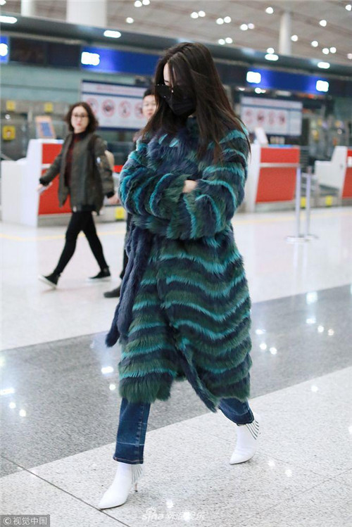近日,迪丽热巴现身首都机场。热巴在宣布退出《跑男》后现身,双手抱胸疾走,大衣颜色好似“孔雀”。