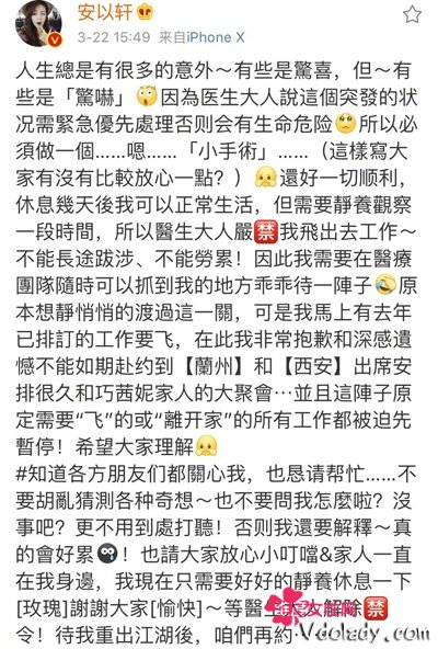 安以轩微博突然晒出自己生病住院照片,称需要做一个小手术,待我重出江湖后,咱们再约。令粉丝纷纷担心不已~ 微博全文: 人生总是有很多的意外~有些是惊喜,但~有些是「惊吓」因为医生大人说这个突发的状况需紧急优先处理否则会有生命危险,所以必须做一个……嗯……「小手术」……(这样写大家有没有比较放心一点?)