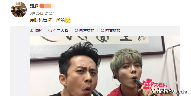 25日,邓超在社交网站上发布与鹿晗一起反拿麦克风的照片,并配字:“鹿晗跳舞挺一般的”。结果遭到鹿晗的反击,在评论中曝出邓超淋水跳舞的热辣舞照,引发网友们的调侃。邓超和鹿晗作为“父子”,经常在微博上互怼,相爱相杀十分欢乐。 网友称:“你为什么要说谎”、“超哥,你咋这么皮”、“没有这么说儿子的!”