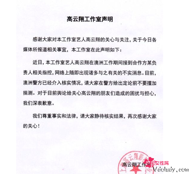 3月29日,据澳大利亚每日电讯报报道,高云翔[微博]在悉尼因涉嫌性侵被捕,3月28日已经进行庭审。该新闻传回国内引发广泛关注,3月29日中午,高云翔工作室发出官方声明,“请大家在警方给出定论前不要擅加揣测”,要静待核实结果。 据媒体报道,高云翔和董璇夫妇此前一直在悉尼拍摄《阿那亚恋情》,该片3月26日杀青,当天就发生了高云翔涉嫌性侵案。据悉,高云翔于悉尼一家香格里拉酒店内性侵一名女子,女子报警称除了高云翔外,还有一名叫做王晶的男子也涉嫌性侵。该女子表示,她和高云翔、王晶进入悉尼一家香格里拉的酒店房间内,两人对自己实施了性侵。