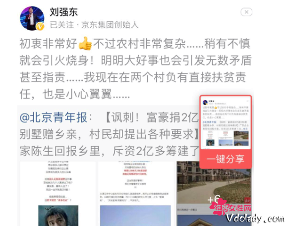 同样热衷为家乡建设做贡献的刘强东现身评论区,称:“初衷非常好,不过农村非常复杂,稍有不慎就会引火烧身!”引起网友热议。 近日富豪建258套别墅赠乡亲反遭村民提各种要求一事引起热议,刘强东对此评论称,初衷非常好,不过农村非常复杂,“稍有不慎就会引火烧身!” 刘强东表示:“明明大好事也会引发无数矛盾甚至指责……我现在在两个村负有直接扶贫责任,也是小心翼翼……”