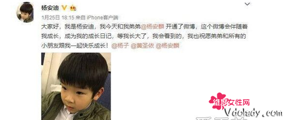 今年1月25日,黄圣依分别为两个儿子都开通了实名认证的微博,她在大儿子的微博上这样写道:大家好,我是杨安迪,我今天和我弟弟杨安麟开通了微博,这个微博会伴随着我成长,成为我的成长日记,等我长大了,我会看到的,我也祝愿弟弟和所有的小朋友跟我一起快乐成长!