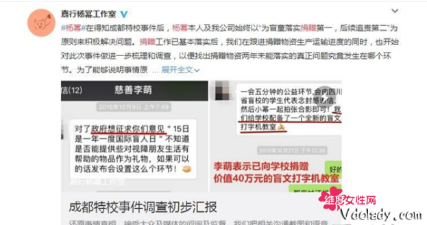 在此次公开的全部细节中显示,“白手杖”助盲公益活动对接人李萌主动邀请杨幂参与“白手杖”活动,称“白手杖”全国助盲公益活动,是旨在募集善款购买盲人用具,并向全国需要的盲人免费发放,关爱盲人生活的全国性公益活动。在确定参与活动后,杨幂捐款购买了200根盲杖,用于“白手杖”活动的发放。李萌表示为感谢杨幂支持,个人将捐款购买300根盲杖也以杨幂名义捐出,同样用于“白手杖”活动的发放。在杨幂参加了“白手杖”北京发布会后,李萌表示杨幂捐赠的盲杖将随杨幂电影路演城市定点发放给当地盲人,以增加助盲公益社会影响力。路演城市包括成都、上海、武汉等地,但最终因为其他地方发行公司安排不了相应的助盲公益环节,所以只有成都做了相关环节。 之后李萌称500根手杖已到位,杨幂方向北京青少年发展基金会[微博],即“红丹丹基金”转账200根手杖费用(附有转账记录),李萌表示对杨幂宣传电影时提到公益很感谢,活动方要追加每个地区的捐赠,共1000根。