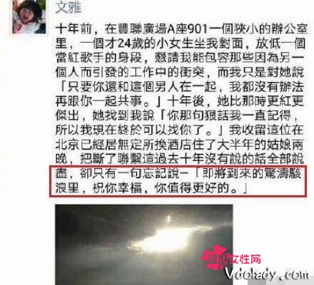 有一名空姐在网上曝料她在自己的航班上遇到了冯柯,说起飞前冯柯一直在和张靓颖通电话,一路上听的都是张靓颖的歌曲,航班延误冯柯也赶紧跟张靓颖汇报,丝毫看不出来感情有问题。 文雅的朋友圈截图被网友曝在网上之后,事情持续发酵,也有不少网友参与到事件的爆料中。文雅在文中表示非常不看好这段感情,并在最后用一句模糊的话隐示张靓颖和冯柯的爱情出现裂痕。包括张靓颖曾经的同门尚雯婕也发文力挺张靓颖,也因此引发了和文雅的诸多口水战。