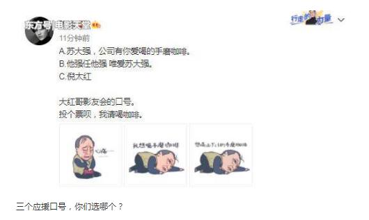 今天,陈坤也发博调侃大红个影友会的口号,陈坤给出了三个应援口号。分别是:苏大强,公司有你爱喝的手磨咖啡;他强任他强 唯爱苏大强;