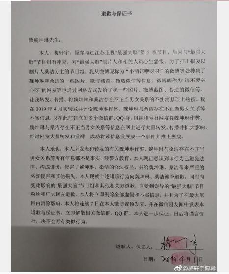 4月12日,《最强大脑》选手梅轩宇通过微博发布道歉声明,承认自己曾捏造魏坤琳与制片人桑洁存在不正当男女关系的谣言,并促使网友传播、发酵,最终成为事件登上热搜。梅轩宇在声明中强调魏坤琳作弊、魏坤琳与桑洁存在不正当男女关系等所有信息都不是事实,自己也已经在警方的教育下意识到触犯了法律,并就诽谤行为向当事人道歉。