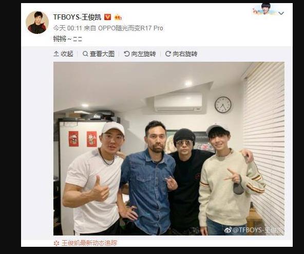 16日凌晨,王俊凯晒出去探班周杰伦、刘畊宏的照片,并写道“锵锵”,随后工作室转发透露小凯此番探班为杰伦送了奶茶。