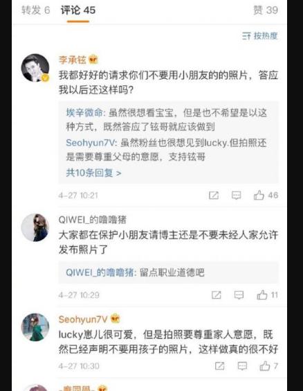 同时,该工作人员也表示,“请那些未经允许发布小朋友照片的跟拍者和营销号立刻删除相关微博,我们将保留追究法律责任的权利!” 李承铉工作室也转发了该条微博,并请求跟拍者尊重铉哥保护女儿的意愿,即刻删除相关照片,也谢谢信守承诺的媒体摄影师对lucky的喜爱与保护。但截至发稿前,该博主仍未删除相关照片。
