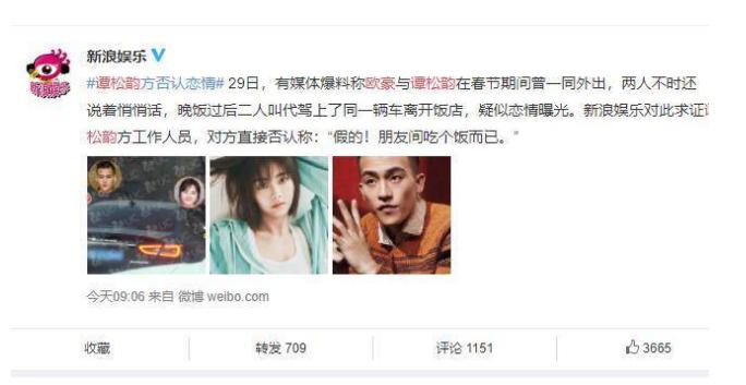 虽然,媒体描述得有模有样,不过,在消息出来没多久,谭松韵方的工作人员便闪电速度般出来辟谣,否认了此事儿,表示“假的!朋友间吃个饭而已!”这个否认的说法好像在哪里听过?