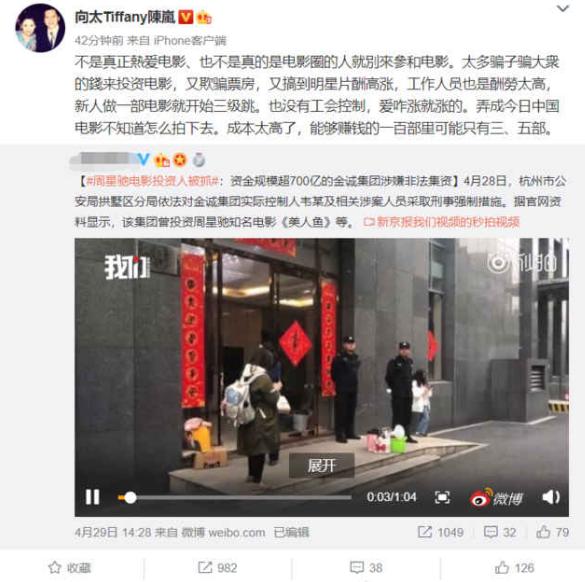 当今社会中,十个人中有九个人是网民,是自媒体人,是博主或是其他什么影评人之类的,在你以为言论自由,在网上可以畅所欲言的时候,你可千万要小心自己的观点不要过于偏激,因为一不小心就被顶上风口浪尖了!近日,网曝周星驰投资人之一的向华强的妻子陈岚被抓,该集团投资过周星驰的电影《美人鱼》《西游伏妖篇》等,只因发表犀利点评被抓!