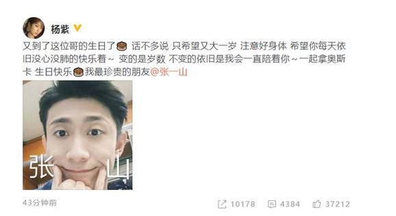 5月5日,杨紫通过微博晒张一山搞怪照为他庆生,并配文写道:“又到了这位哥的生日了!话不多说,只希望又大一岁,注意好身体,希望你每天依旧没心没肺的快乐着!变的是岁数,不变的依旧是我会一直陪着你,一起拿奥斯卡。生日快乐,我最珍贵的朋友@张一山 。”照片中,张一山嘴巴抿成“一”字,非常的逗趣。