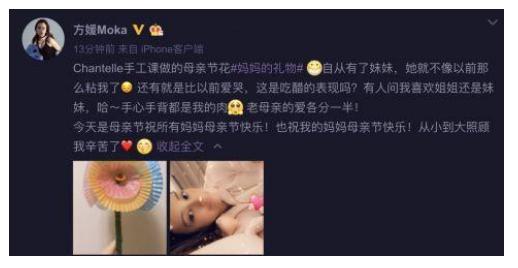5月12日母亲节,刚刚诞下二胎的天王嫂方媛在微博晒出与小女儿的自拍合照,以及大女儿为她做的母亲节手工礼物。照片中,还在坐月子的方媛气色红润,温柔的抱着小女儿,看来身体恢复的不错。