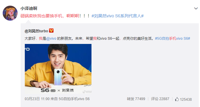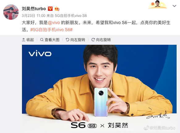 这几天喜欢刘昊然的朋友们过节了,刘昊然与vivo S6牵手成功,出来营业了。