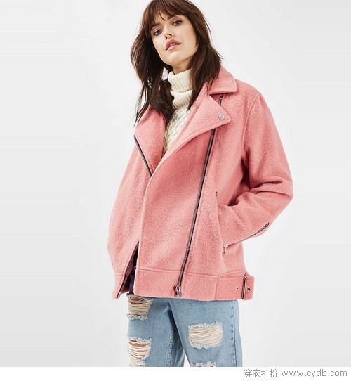 当永远穿不错的帅帅机车外套也变得粉粉嫩嫩,又美又暖的风格就出现了,酷帅和甜美变得可以共存,亲和力自是加倍,配高领衫牛仔裤穿法简单可以无限复制,画面与色调却变得柔和温暖了许多。