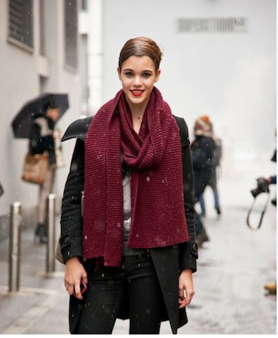 冬季一条红色或色彩鲜艳的围巾可以让整套Look不再沉闷,如果你的大衣颜色偏暗,可以戴条亮色围巾来提亮。