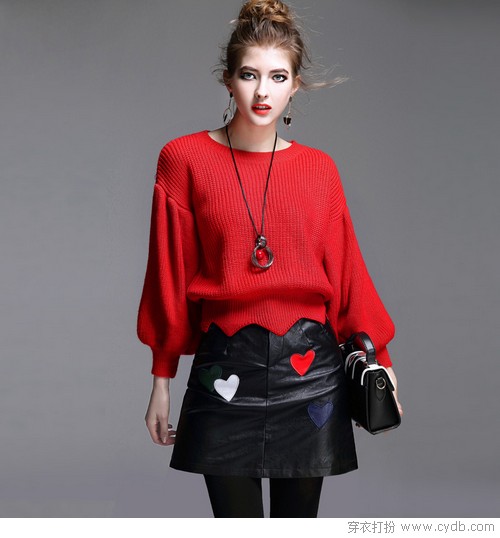 02 撞色撞材质的真两件,浓酽醇厚品不尽的红与黑,充分体现自信无畏和轰轰烈烈的个性,皮裙增添了一份犀利时髦感,桃心朵朵和波浪下摆灯笼袖相呼应,颇显复古可爱。