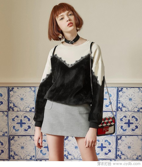 05 假两件上衣结合流行元素拼出层叠美感,黑色丝绒冷酷魅惑,米色卫衣纯净柔和,吊带蕾丝用细腻质感说话,素色奠定整身基调,配饰点亮呼应,整体繁简得宜,展现青春优雅范。