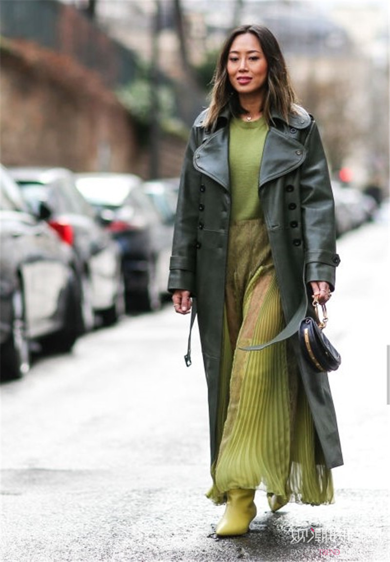 墨绿色以复古优雅的味道打造出女王范气场,外套选择长款黑色皮衣,穿出高级质感。