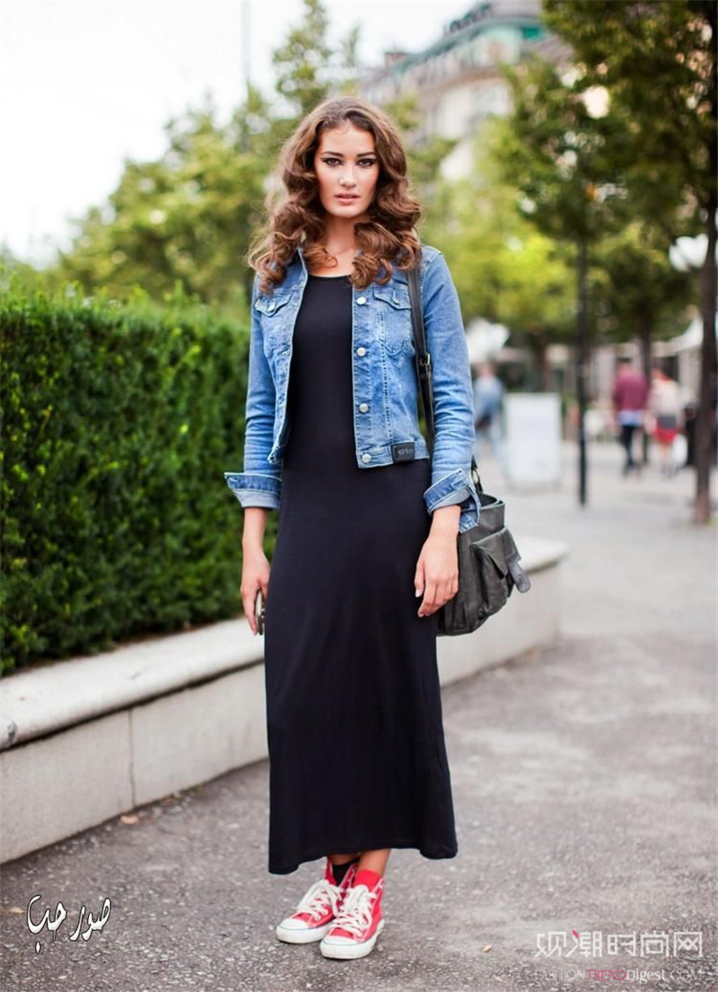 高开叉型长裙似的衣着风格更加自由张扬,搭配短款牛仔外套,打造出休闲街头感。