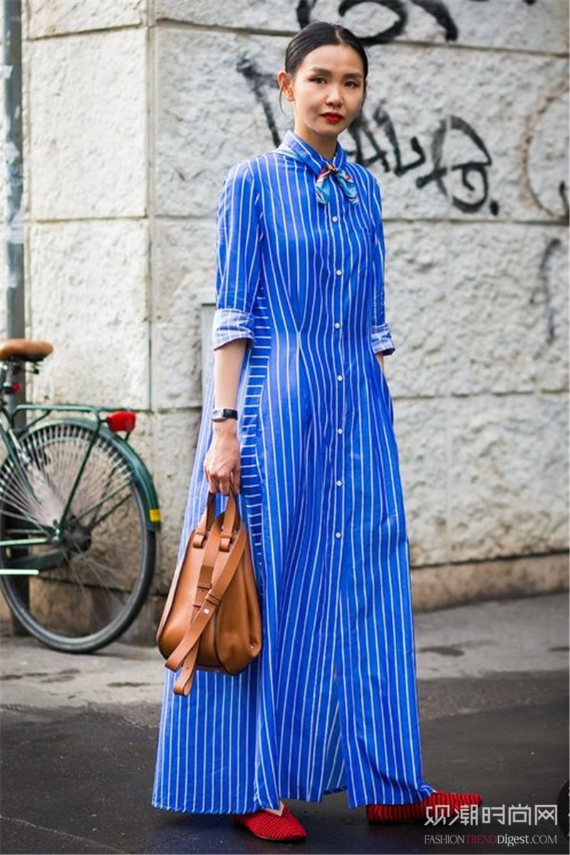 竖型条纹以显瘦效果受到众多潮人的青睐,蓝底色吸睛十足,白色条纹细腻自然。