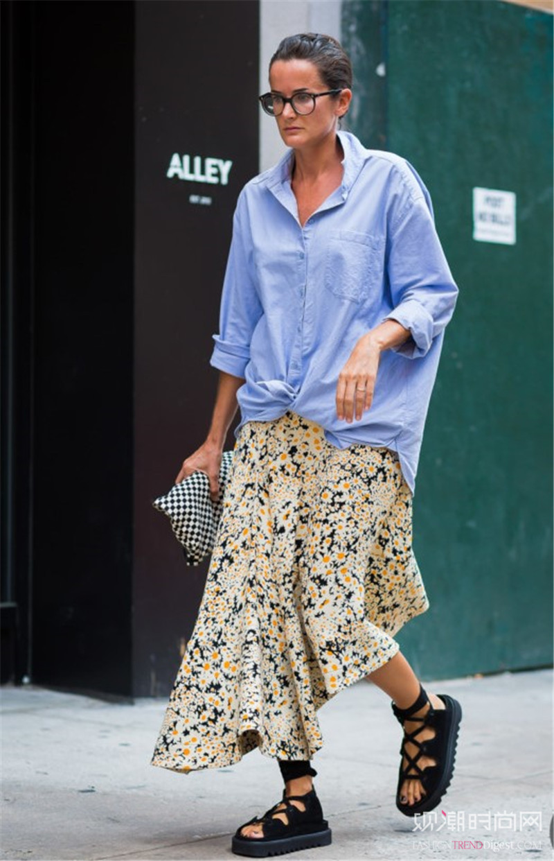 小碎花长裙搭配浅蓝色衬衫,小清新味十足。
